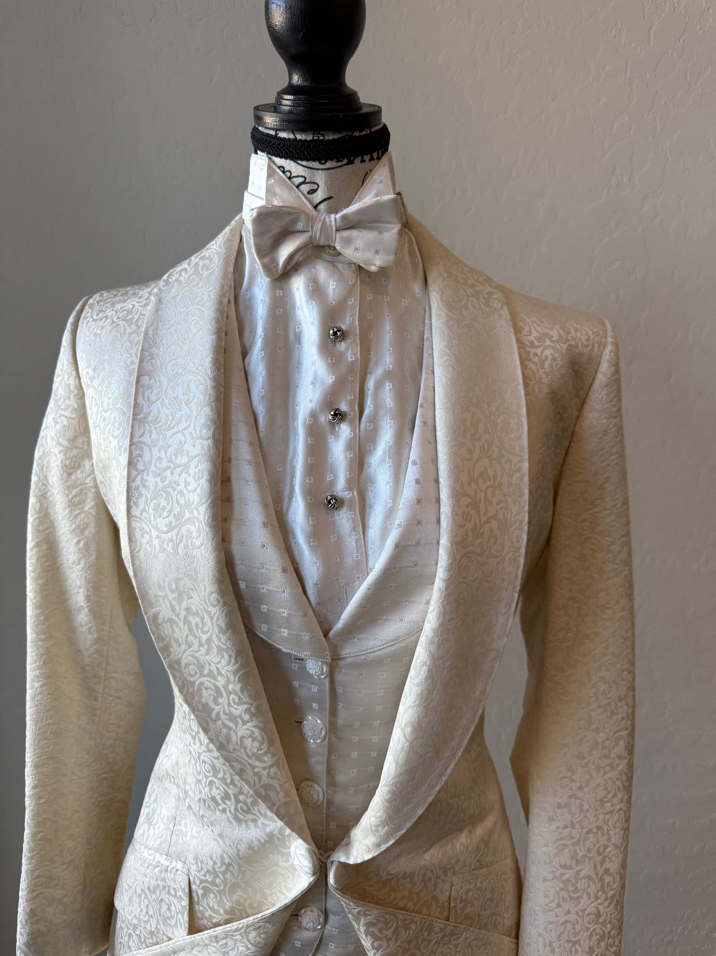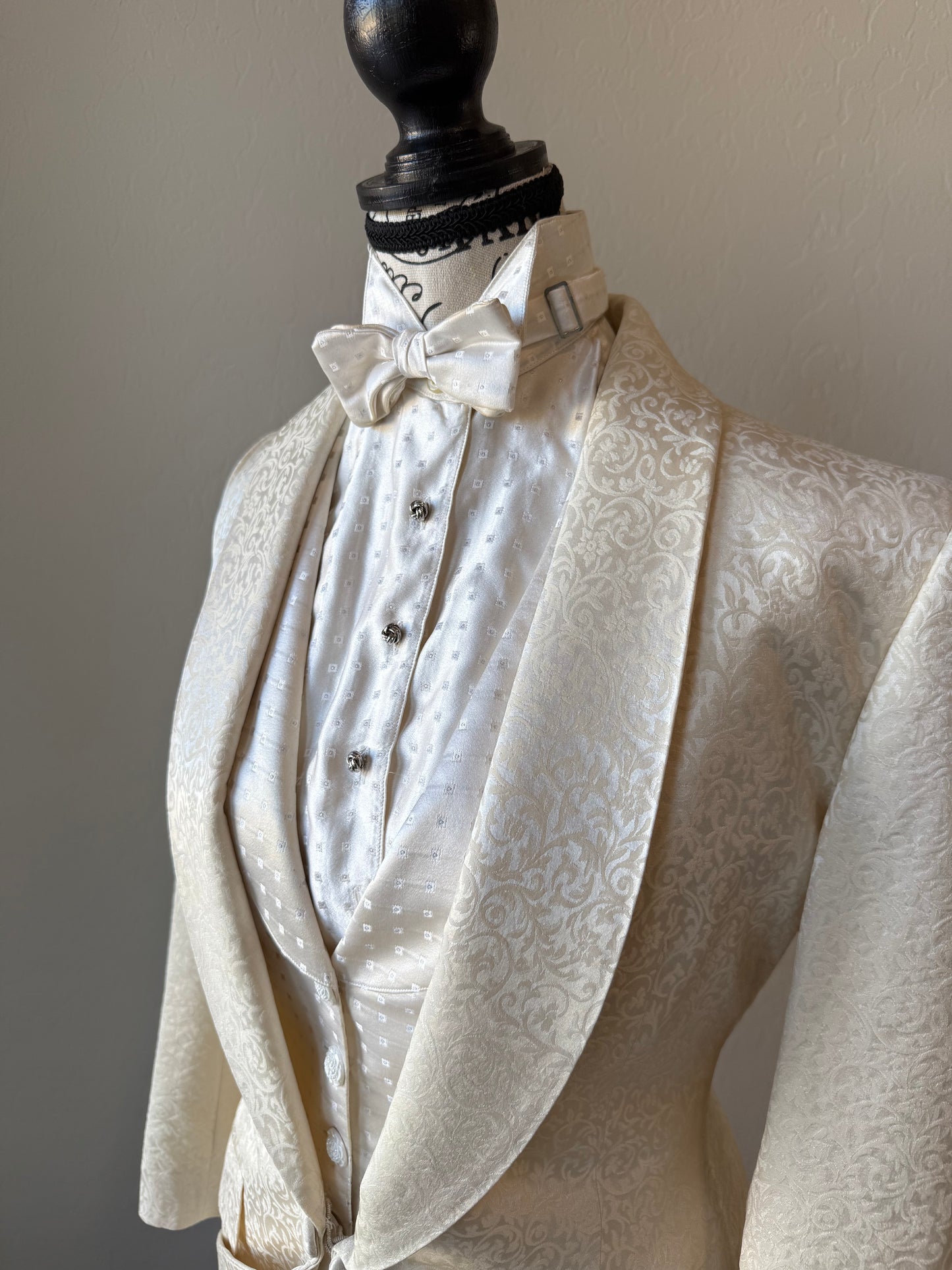 By Becker Brothers. Shown with formal attire but can easily go to day wear with informal shirt and vest. Classic ivory paisley for a timeless look. Approximate ladies size 4-6.