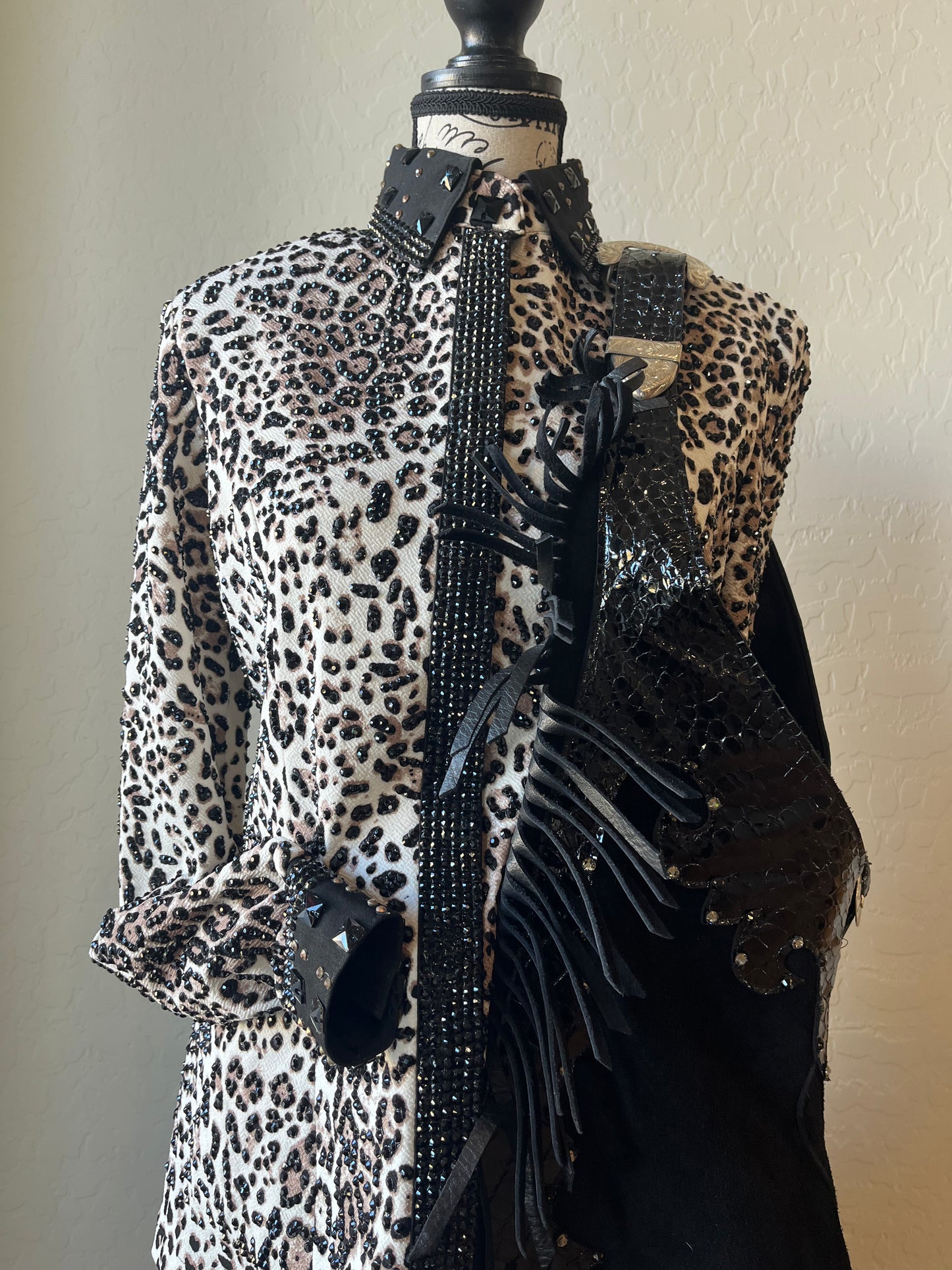 By Show Season. A fantastic look with leopard and black stones! Details on cuffs and collar. Chaps are sold separately. Ladies size M