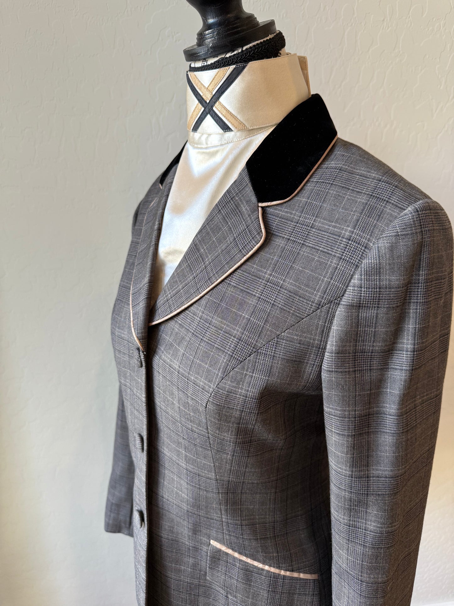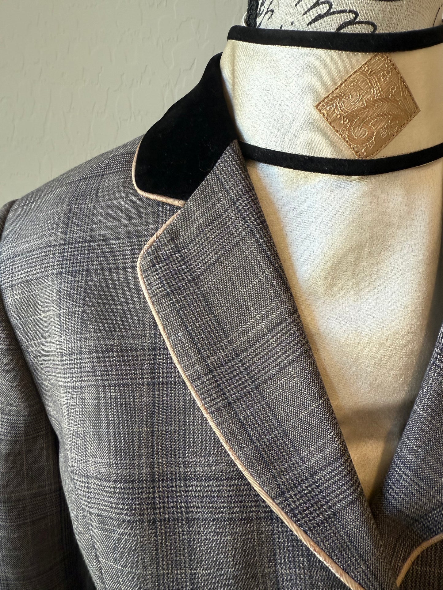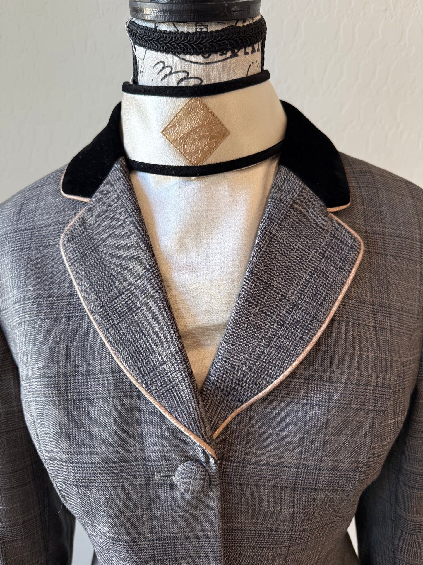 By Custon Collars. Never worn. No detail missed in this gorgeous coat. Gray, brown, black classic plaid with black velvet collar accent and cream piping.Two coordinating dickies are also available. Approximate ladies 0-2 Youth 14
