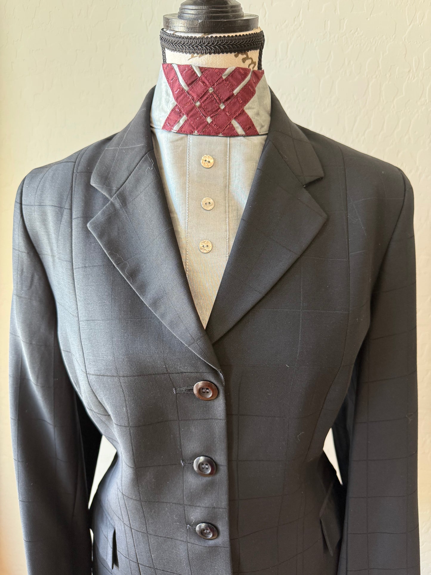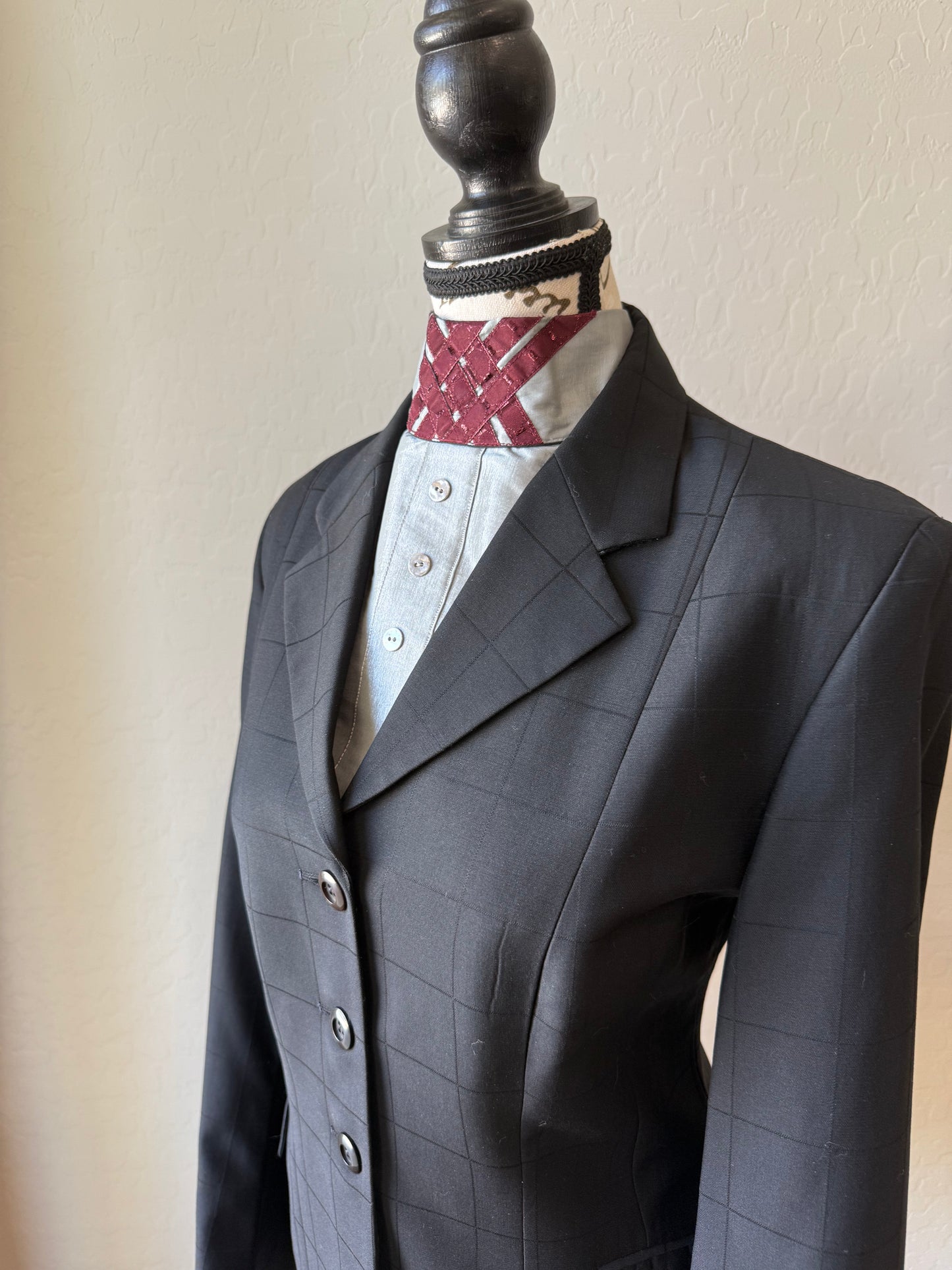 Traditional black hunt jacket with a black tone on tone box stripe for added dimension. Hadfields Saddlery. Made in Canada. Perfect for main ring or sport horse. Would also be ideal for equitation. Ladies size 8-10. Dickie also available
