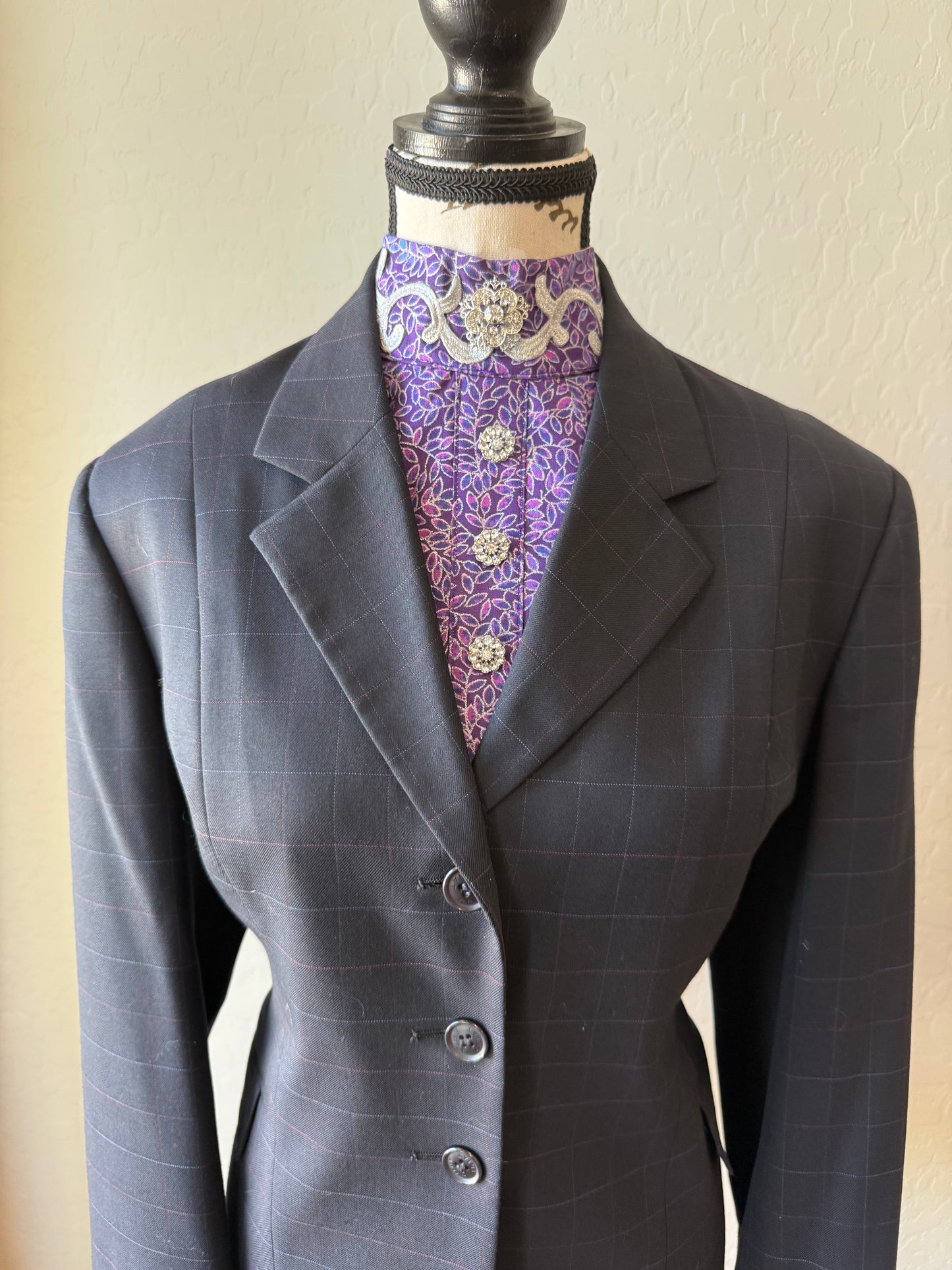 Ladies classic navy windowpane hunter jacket with pink and lightblue contrast. Ariat Approximate size 10-12. Dickie also available.